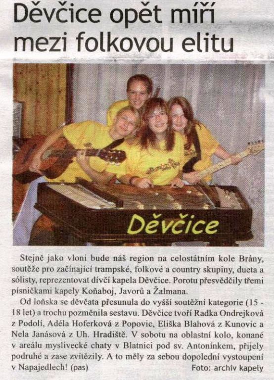 KAPELA DĚVČICE bude zastupovat náš region na celostátním kole BRÁNY - soutěž pro začínající trampské, folkové a country kapely - členkou kapely je i Adéla Hoferková z Popovic