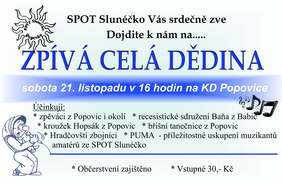 21.11. uspořádali spoťáci po loňském úspěšném nultém, již oficiální první ročník soutěžního pořadu Zpívá celá dědina o titul Popovická sýkorka. Přesto, že účast zpěváků nebyla nijak velká, program trval téměř 3 hodiny a podle reakce lidí, se nikdo nenudil. K dobré náladě jistě přispěli nesoutěžní taneční, pěvecké a hlavně herecké výkony účinkujících. V programu vystoupili: Břišní tanečnice z Popovic – moderní i břišní tance, Hradčovští šohaji s pásmem zbojníci, sdružení Baňa z Babic – hodové pásmo v Babicích, Hopsák z Popovic - besídka dětí z mateřské školy. Nesmělo chybět ani hudební vystoupení PUMA – příležitostného uskupení muzikantů amatérů z řad členů sdružení SPOT Slunéčko.